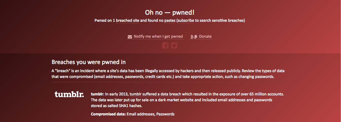 The website is pretty straightforward. Just type in your email address and they will tell you which accounts have been breached. I did the test with an old email address of mine and got the result that a tumblr account was breached.