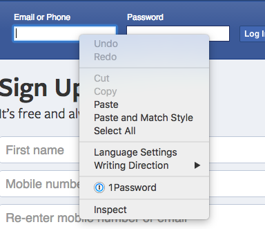 I use 1Password as my Password Manager. So, how does it work? All my passwords are stored in what is called, a vault. This vault can be found on as file on you hard drive. Now, when you want to login on a website, you have to right-click on the first text box as you can see in the screenshot below: