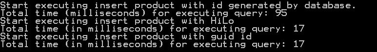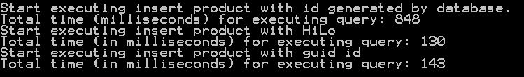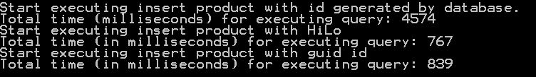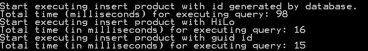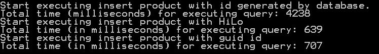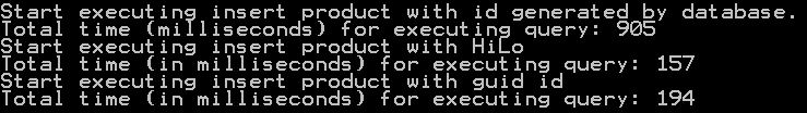 You will notice that the difference is much bigger then when inserting 200 records. The first method has a difference of 57ms. The other 2 methods are only 27ms (for HiLo) and 51ms (for Guid). The GUID results are pretty high for this test run.